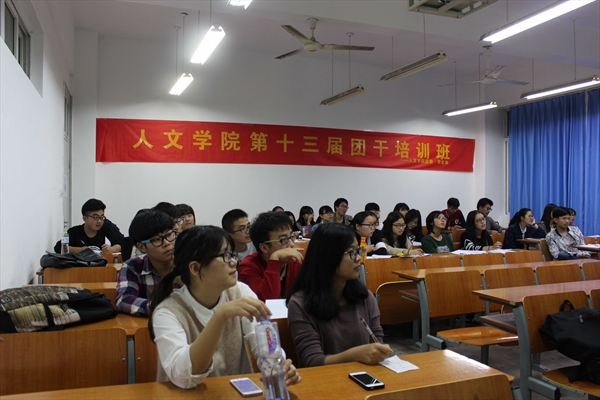 第十三届团学干部培训班第六课在人文楼105教室举行。本次团干培训由前人文团学团委副书记叶益如发表讲话。人文团学主席郭佳乐,团副沈亦炜及全体人文团学干事、大一各班班长、团支书参加了此次培训。