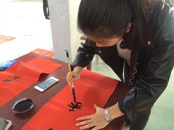 在当地村官的带领下,大家一行人来到了夏林头文化礼堂,拉好横幅并进行简单的介绍之后,参与此次暖冬行动的同学们安置好随身携带的书法工具,开始书写春联,村民们纷纷主动上前帮忙。“绿竹别其三分景,红梅正报万家春。”“民安国泰逢盛世,风调雨顺颂华年。”一幅幅字迹优美的春联得到了村民们的赞美,我院学生将春联赠予村民,并合影留念。乐清电视台的记者分别对岭底乡村民和我院学生进行了采访,村民表示这样写春联,送春联的活动让他们感到特别温暖和感动,我院学生认为参与此次暖冬行动不仅是为村民们送去祝福,也是通过这次机会发挥了自己的特长,回馈社会。写春联活动在和乐融融的氛围中顺利结束了,但这一份暖意将一直留存在岭底乡村民的心头。