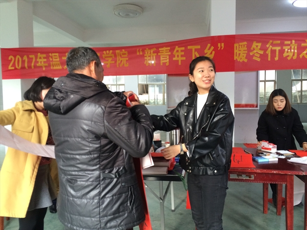 的同学们经过近两小时的车程,到达目的地乐清市岭底乡夏林头文化礼堂,开展了“新青年下乡”暖冬行动之“走进岭底,挥墨迎春”。在本次活动中,我院学生为岭底乡村民誊写了新春对联,给村民们送去了温大人文学子的暖心祝福。乐清电视台和乐清日报的记者们也来到了现场,对本次暖冬行动进行了相关的采访和报道。