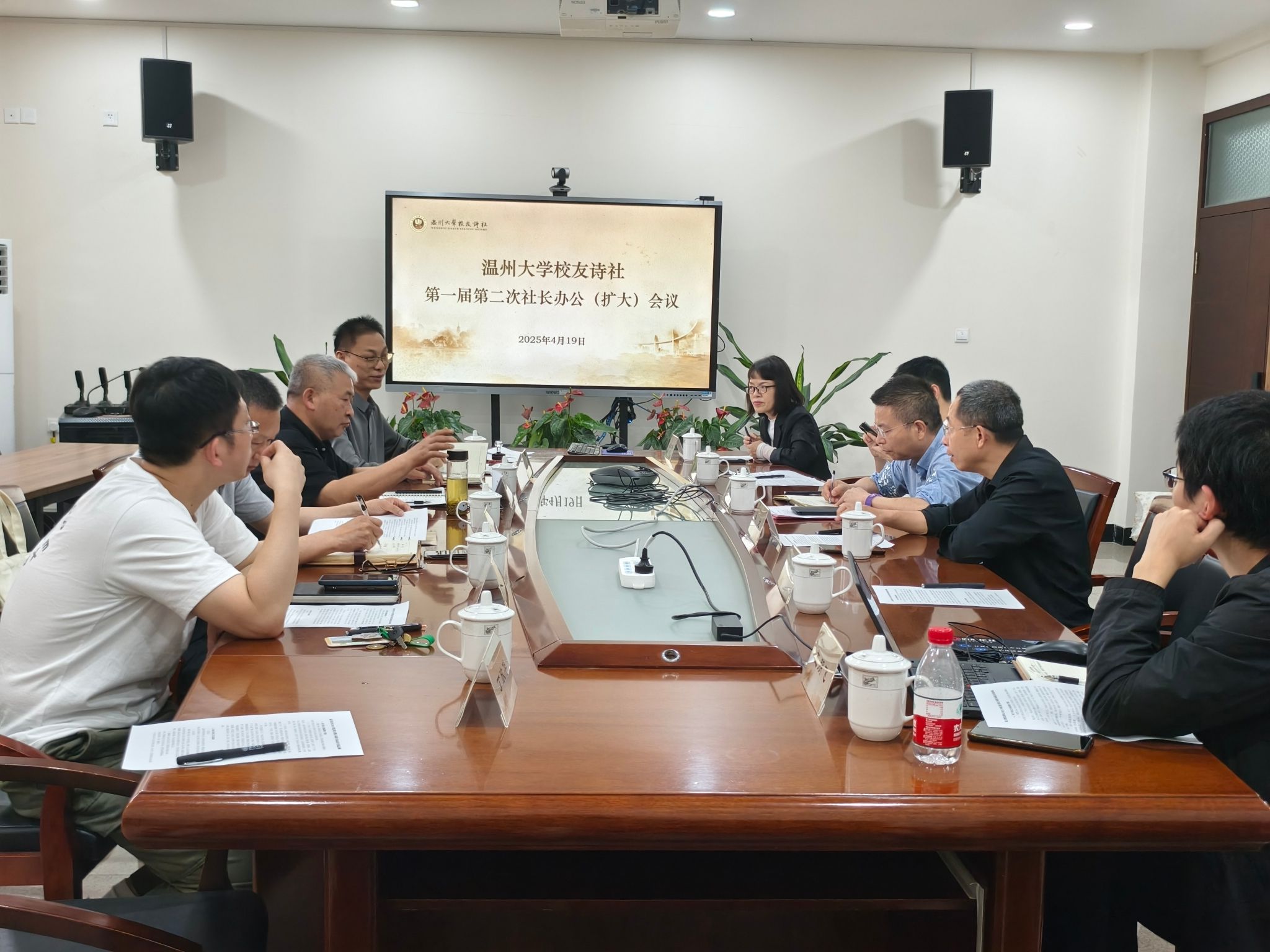 为了更好安排诗社下阶段工作,2025年4月19日下午,温州大学校友诗社第一届第二次社长办公(扩大)会议在人文楼213会议室召开。本次会议由徐顺聪社长主持诗社部分领导班子成员参加