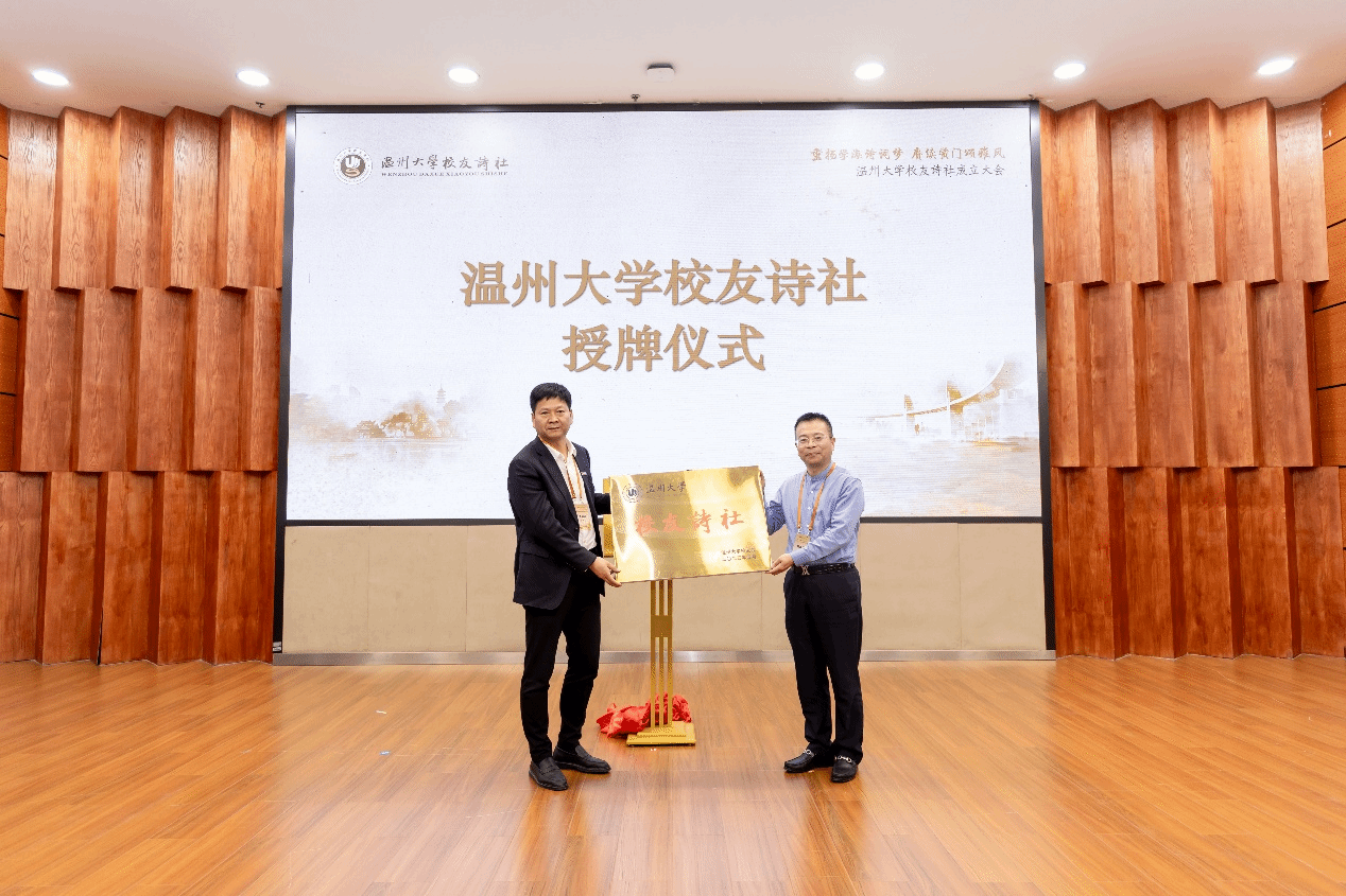 温州大学校友会秘书长陈宏毅宣读温州大学校友会《关于同意成立温州大学校友诗社的批复》文件,党委副书记庄兴忠为校友诗社授牌。大会通过了《温州大学校友诗社章程》,选举徐顺聪为诗社首任社长,方志方、张龙、林振文、陈胜武、南航为副社长,林振文为秘书长。经诗社社长办公会讨论,决定聘请叶长海、钱建民、周清印、钱志熙、黄纪云、张索、潘凡平、张洪国、孙良好、童洪锡担任诗社顾问,聘任方志方等校友为各部门负责人。大会向社长、副社长(秘书长)、顾问及各部门主要负责人颁发聘任证书。