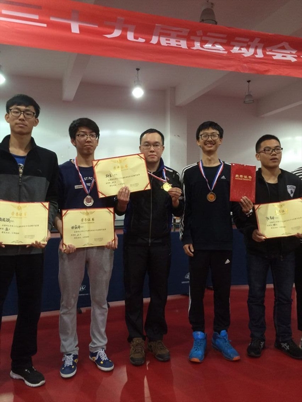 在相关老师和同学的辛勤组织下,我院派出五男五女参加了本次球赛,并根据赛程安排进行了男女单打、男女双打、混双等小组赛。选手在赛场一展才华,傲视群雄。尚未上场的选手中,有的在外场积极热身,有的在赛场呐喊助威,现场人声鼎沸,气势恢廓。第一晚的小组赛结束,我院选手虽多数未能进击决赛,但都觉得借此机遇能与外院高手过招亦属幸事。25日晚18点,巅峰之战火热开打。我院研究生郑重学长与超豪学区新科冠军鏖战良久,顺利冲进决赛后,再与自己的校队队友较量,最终以3:0的比分斩获本届比赛男子单打冠军。我院荣膺全校排名第九的好成绩。